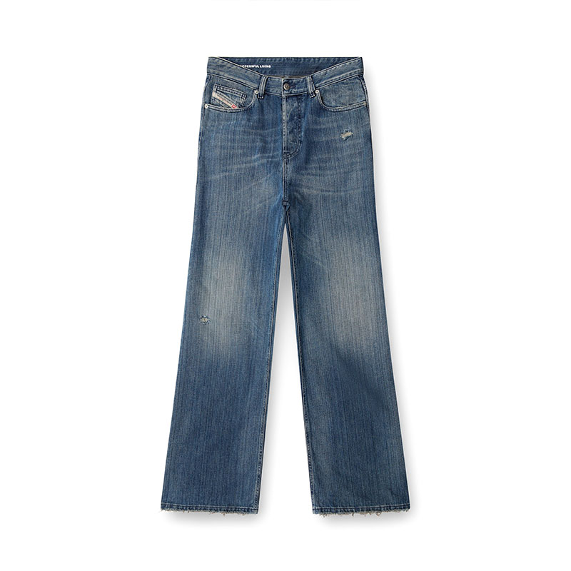 Crafted using regenerative cotton, this fix denim showcases a bold streaky effect, enriched by whiskering and small abrasions for a distinctive worn look.