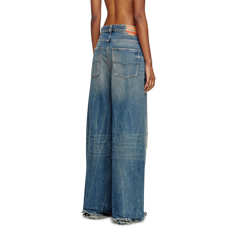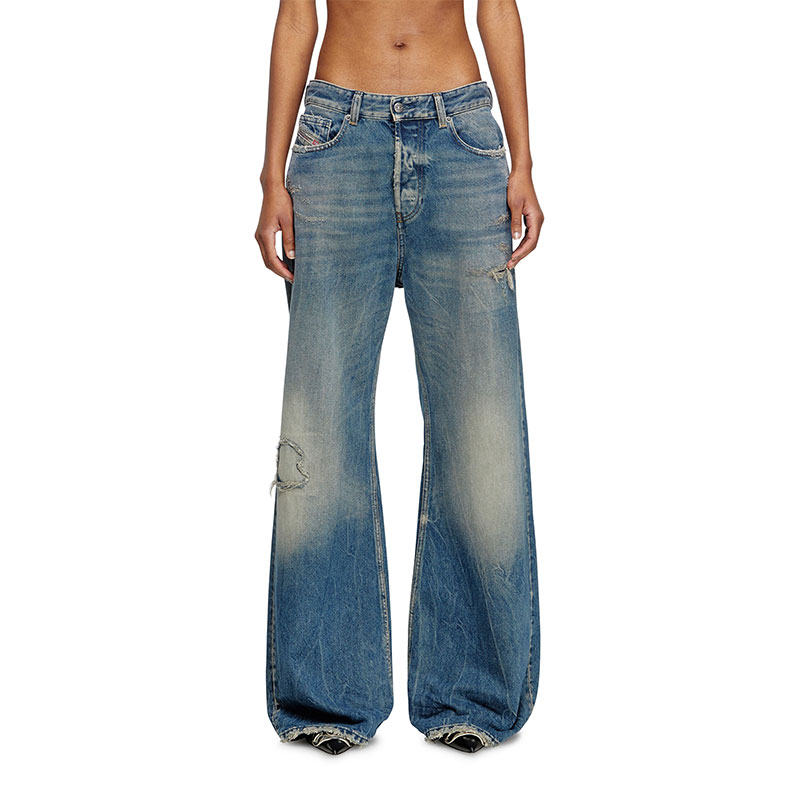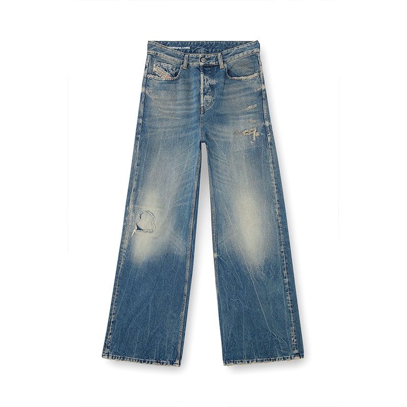 Interpreting Diesel's signature destroyed aesthetic in medium blue, this fix denim is crafted from organic cotton and enriched with ripped and repaired patches and a subtle all-over dirt effect.