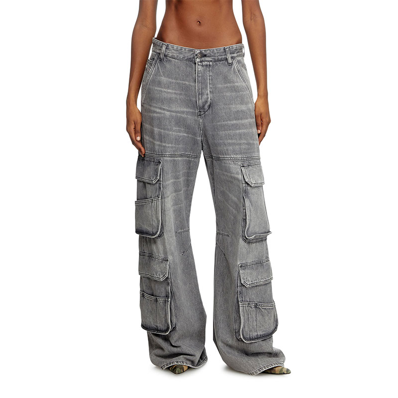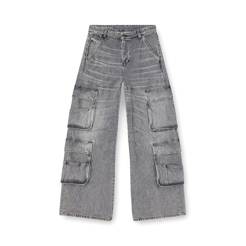 Relaxed fit with a low waist and low crotch, and extra-long wide leg. The loose, drapey silhouette is amplified by oversize cargo pockets. Button fly.