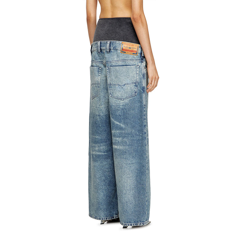 Relaxed fit with a high body-hugging basque, secured to a classic 5-pocket waistband that creates the illusion of a bumster jean. The low crotch and long wide leg enhance the extreme silhouette. Button fly.