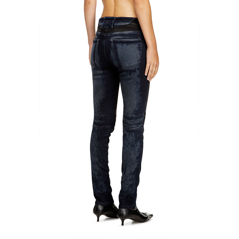 Inspired by Diesel’s heritage and continuous innovation, this bicolour wash channels a bold biker aesthetic. Crafted from super stretch denim in organic cotton, it combines two contrasting washes – dark blue and black – that enhance the construction of the garment. Lasered whiskers with a striking negative effect, and a total fade black treatment achieve an authentic worn-in effect.