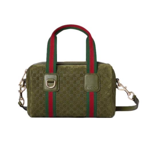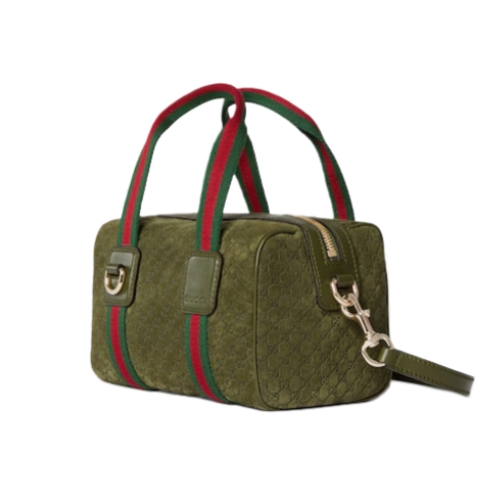 Inspired by the Gucci duffle silhouette, the Mini GG handbag continues to revisit the House’s codes and celebrated travel legacy with different materials. This version is crafted in suede for an added touch of sophistication, which speaks to its effortless elegance while highlighting the signature GG motif.
