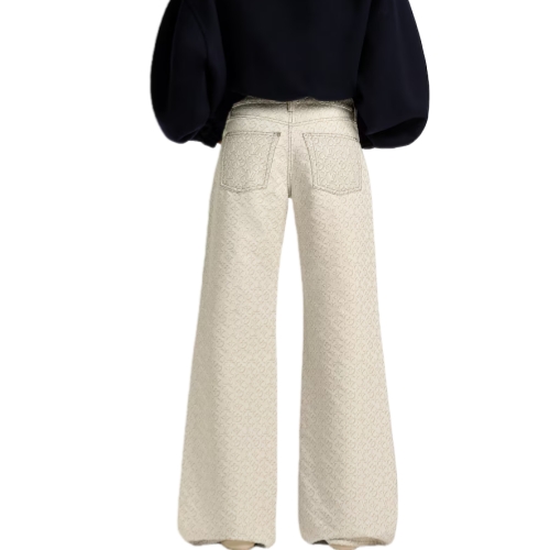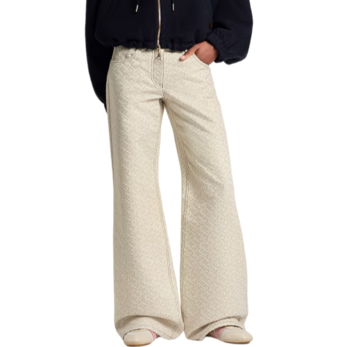 These jeans make a chic statement in an allover print of this season’s graphic trompe l’oeil 3D-effect Monogram motif, with contrasting topstitching highlighting the construction. They are cut from cotton gabardine in a clean wide-leg, high-rise silhouette. A metallic Monogram Flower button adds a playful finishing touch to the fly.