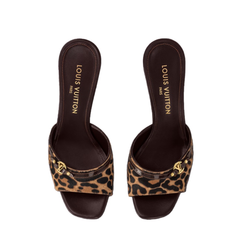 The 6AM mule is reimagined in hairy calf leather with a perennially stylish leopard print. This model is notable for its wide front strap, which features a narrow, decorative strap in patent leather embellished with a gold-toned LV Initials accessory and two tiny studs. It comes on a high heel with a distinctive flared shape.
