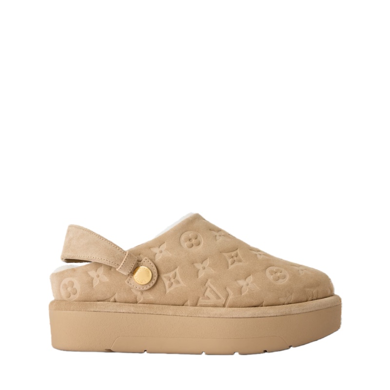 The Aspen platform closed mule is reimagined in velvety suede calf leather debossed with the Monogram pattern. A soft and warm shearling lining further enhances the comfort of this relaxed, easy-to-wear style, which comes on a rubber flatform outsole. Its removable strap, secured with engraved, gold-toned studs, can be worn at the front or back.