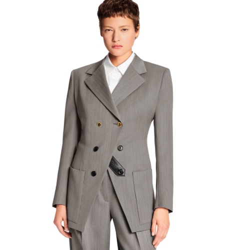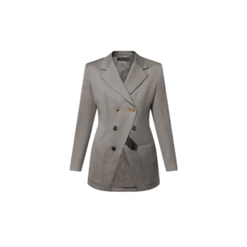 This wool blazer has a smart, structured look in a tapered silhouette finished with oversized notched lapels, large patch pockets and an asymmetrical front. Two golden buttons add a chic metallic accent to the double-breasted fastening, while a leather tab finishes the look with a contemporary flourish. Complete with a silk-blend Monogram lining.