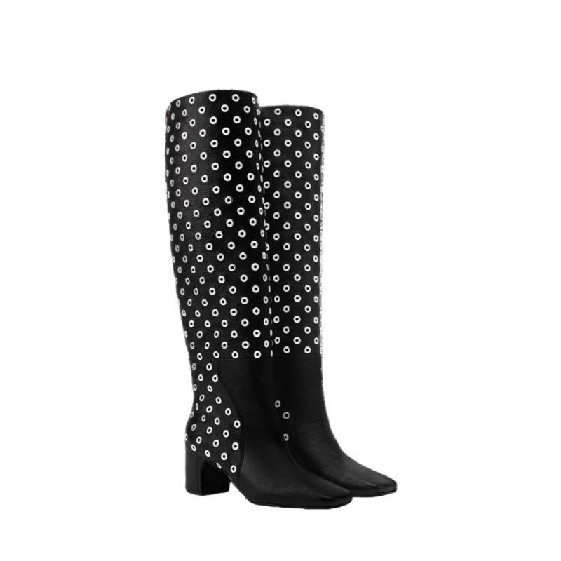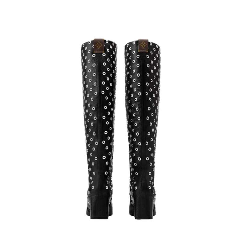 The Avalon high boot is made of grained calf leather and embellished with silver-toned eyelets, which give it an armor-like appearance. Designed for striding out, this model has a square toe, a stable block heel and a tubular shape allowing it to be pulled on with ease. It is signed at the back with trim in Monogram canvas.