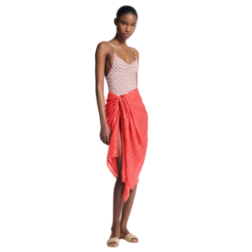 The Beach Pare All Sunset pareo offers plush, elegant protection from the summer sun. Crafted in a soft, fluid silk-cotton blend adorned with a refined variation of the Monogram motif, it features a sumptuous signature accent: a leather triangle emblazoned with the LV Initials. Versatile, with multiple styling options, it is the ideal companion for a summertime getaway.