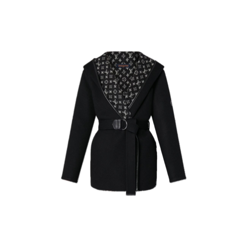 This chic short wrap pea coat is updated for the season in a fresh colorway and signed with the collection’s Louis Vuitton Paris belt for a contemporary touch. The double face wool-silk blend is soft, lightweight and warm, with a voluminous hood amping up the coziness. Complete with an iconic Monogram jacquard on the inside.