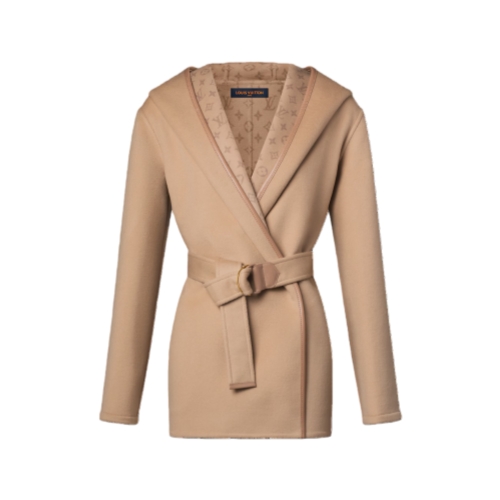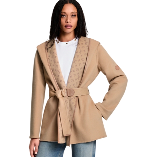 This chic short wrap pea coat is updated for the season in a fresh colorway and signed with the collection’s Louis Vuitton Paris belt for a contemporary touch. The double face wool-silk blend is soft, lightweight and warm, with a voluminous hood amping up the coziness. Complete with an iconic Monogram jacquard on the inside.