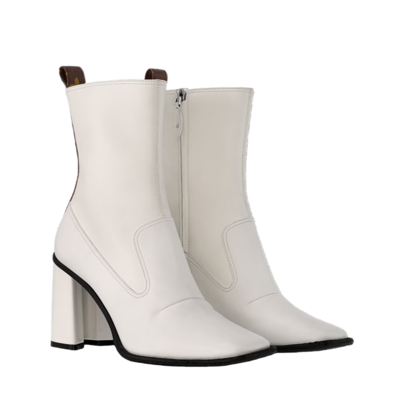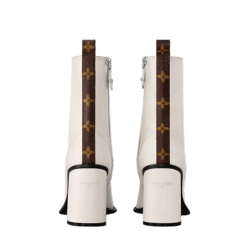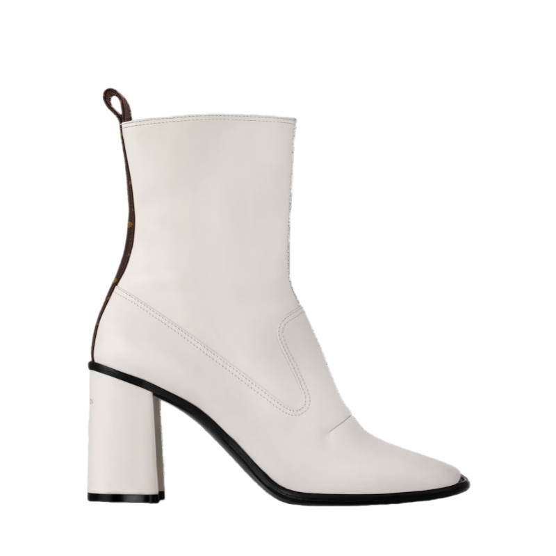 The Berlin ankle boot is crafted from supple calf leather for a stretchy, second-skin effect. The upper is complemented by an equally sleek, leather-covered heel in the shape of a half-Monogram Flower, which is embossed with the Louis Vuitton signature. This model was a highlight of Nicolas Ghesquière's 10th anniversary show for the House.