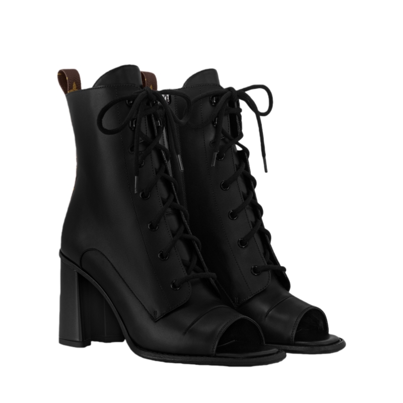 The Berlin open-toe ankle boot is a striking design in smooth calf leather. As well as its sensual open toe, it is distinguished by its full-length laces, which go all the way up the front, ending with hiking boot-style hooks. This model is finished with a high block heel and a back loop in Monogram canvas.