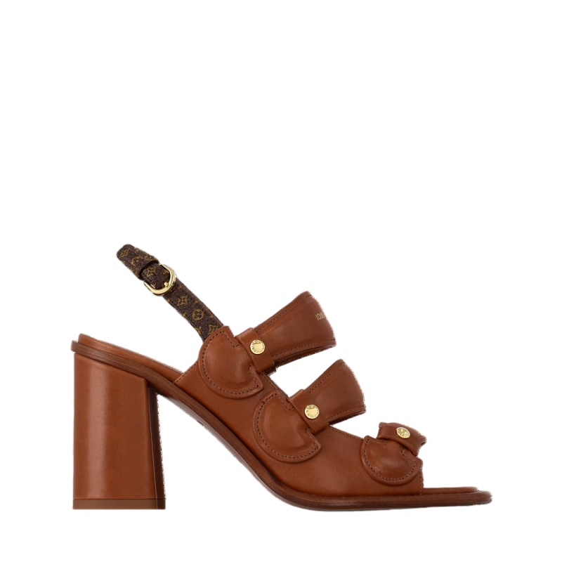 The Berlin sandal is an elegant and original style crafted from smooth calf leather. Its three front straps, one of which is embossed with the Louis Vuitton signature, are shaped like the handles of the House's historic trunks. This model is complemented by engraved metal studs, an adjustable back strap in Monogram canvas, and a high block heel.