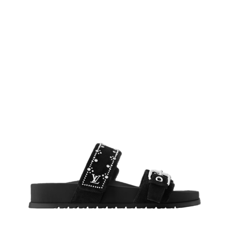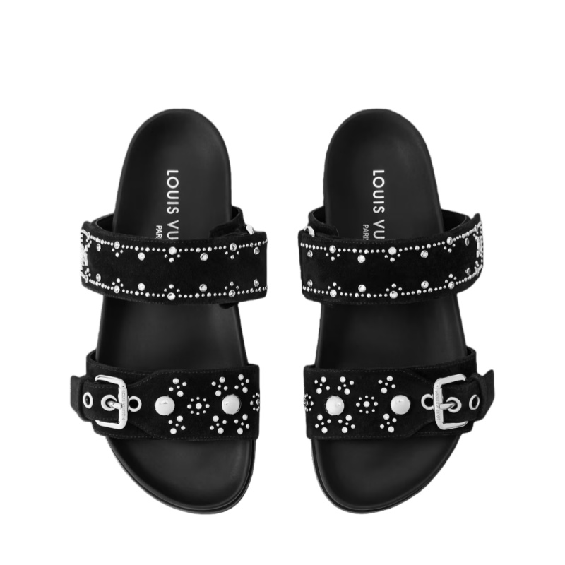 The Bom Dia comfort mule is revisited this season in velvety suede calf leather. Its two adjustable straps are embellished with a pattern of tiny, silver-toned studs, adding a refined touch to this easy, go-anywhere style. This model is finished with a comfortable anatomic footbed and a supple rubber outsole.