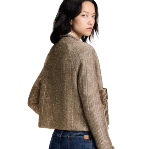 Drawing on defiant, decorative styles of medieval armor, this boxy cardigan from the runway collection is spun from a glittering metallic wool-blend knit. The front is embellished with two structured flap pockets highlighted with shimmering sequins for added texture, while the open front is finished with a rolled hem for an elevated look.