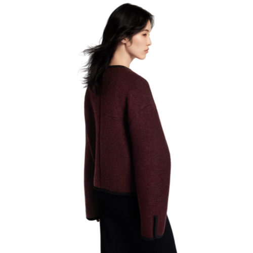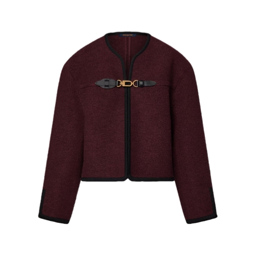 This jacket is timelessly elegant in plush wool bouclette in a rich seasonal shade finished with graphic black piping. It is cut in a versatile boxy shape with a clean neckline, while the front is fastened with the House’s signature carabiner buckle trimmed with leather details for a sleek, modern touch.