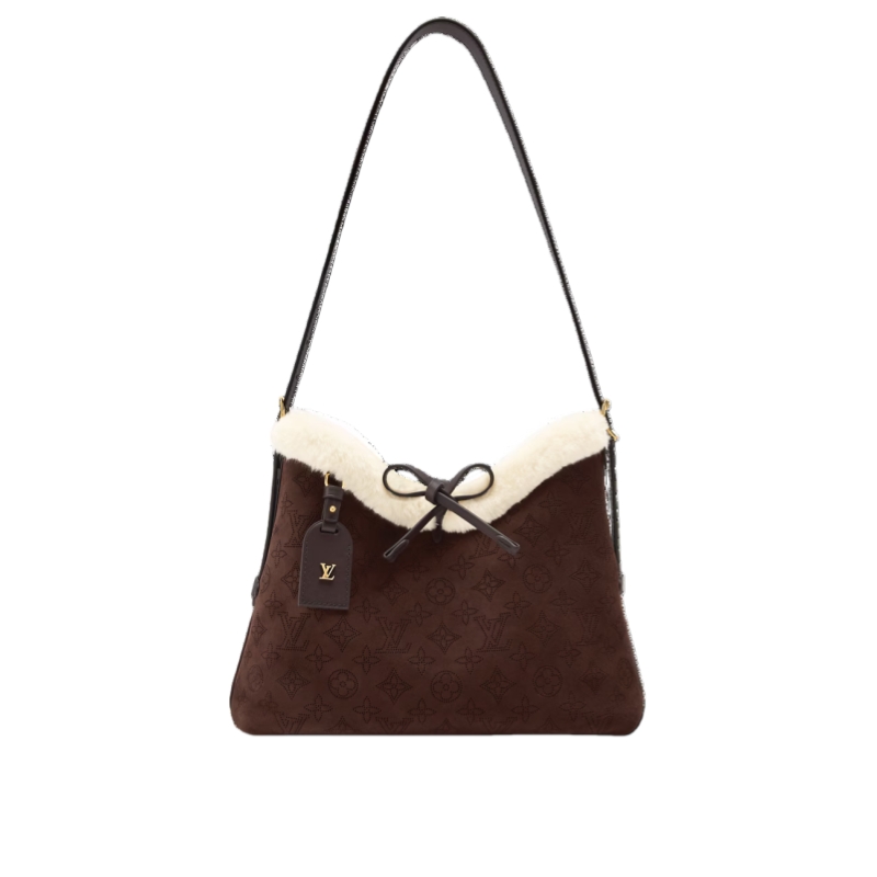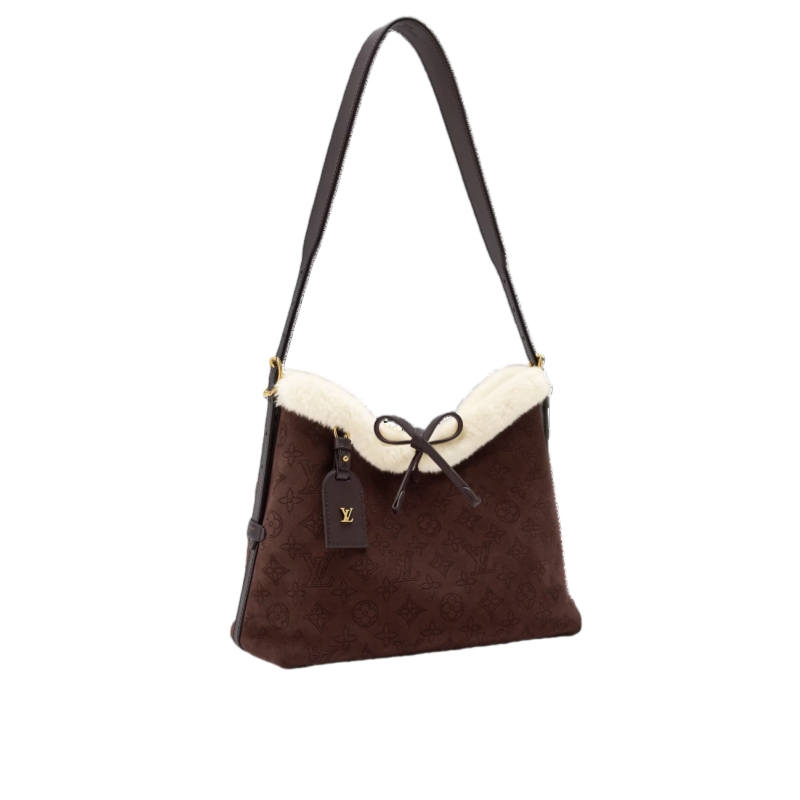 Crafted from soft and velvety suede in a rich Chocolate hue, this LV Ski CarryAll PM belongs to the Cozygram collection. A trendy and collector-worthy bag, it is trimmed with contrasting shearling and adorned with gold-toned hardware for a sophisticated finish. Inside, it is fitted with multiple pockets to store essentials, and also includes a signature name tag that can be removed if desired.