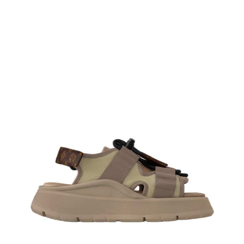 This edition of the Chameleon platform sandal comes in a mix of materials, including canvas and suede calf leather. First seen at the Cruise 2025 fashion show, this avant-garde model is embellished with a cartridge-belt detail in leather and a key bell in Monogram canvas. It is finished with a comfortable padded insole and rubber platform outsole.