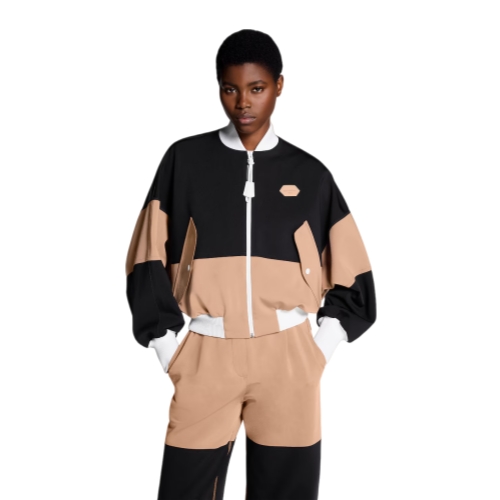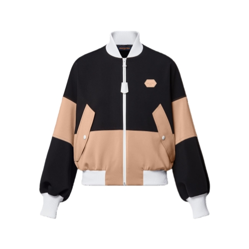 This zip-up bomber jacket is refreshed with a modern, sporty look in the House’s go-to technical jersey. It is crafted in a graphic color-blocked finish with contrasting ribbing highlighting the collar, waistband and cuffs. Exaggerated snap-button pockets add a play of proportion to the boxy silhouette, while a Louis Vuitton Paris patch subtly signs the chest.