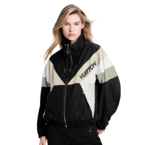 This zip-up windbreaker has a fresh, graphic feel in a lightweight cotton-nylon blend in a dynamic color-blocked construction. It is crafted in a relaxed fit with elasticized hems and a cozy high neckline with a drawstring to keep out the cold. Two fastened side pockets add a practical touch, while a sporty “Vuitton” signature completes the look.