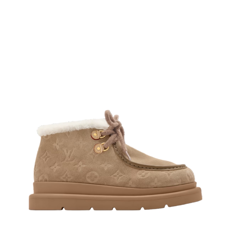 The Cortina low boot is a winter-ready style belonging to the LV Ski capsule collection. It combines an upper in Monogram-debossed suede calf leather with a warm and fluffy shearling lining and a slip-resistant rubber outsole. Thick laces with natural leather trim complete this versatile design, a stylish option for both the slopes and the city.
