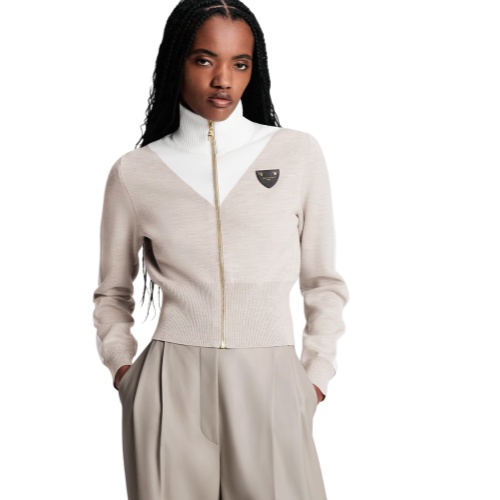 This zip-up jacket is a chic update on a sporty style in a cozy wool blend finished with a graphic color-blocked accent across the chest, shoulders and sleeves. An oversized ribbed waistline adds definition to the cropped silhouette, while a high collar amps up the warmth. A leather Louis Vuitton Paris patch signs the chest.