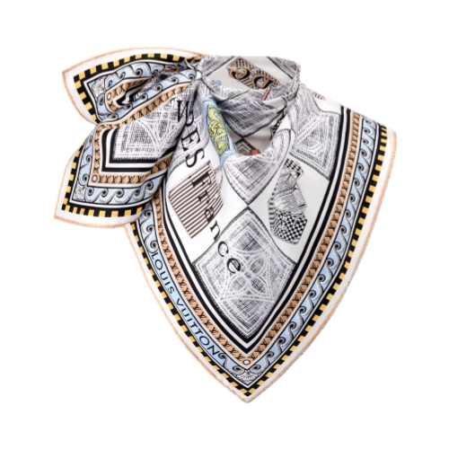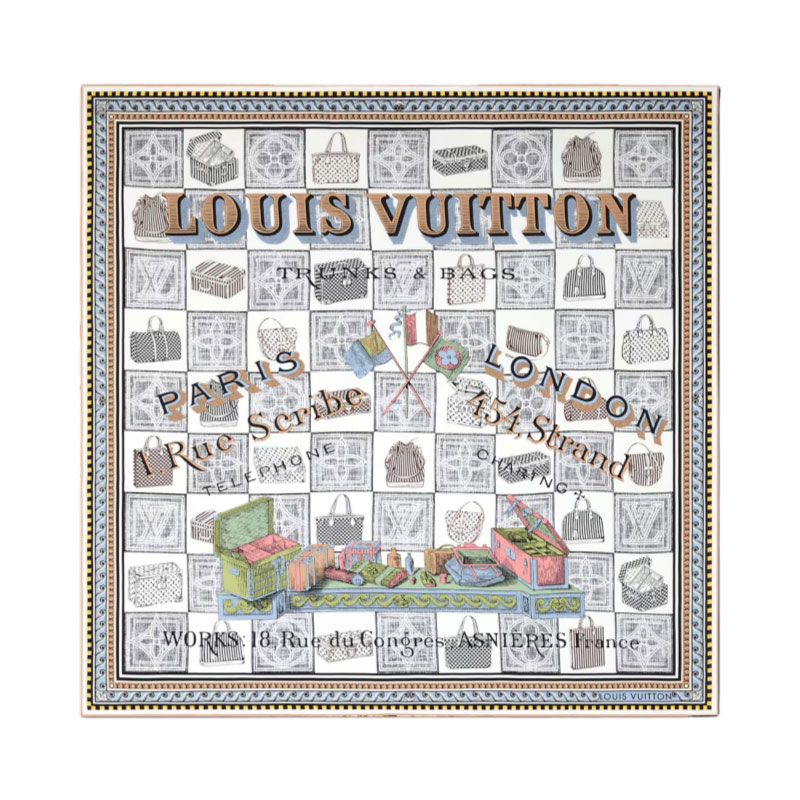 Styled in pure silk, the Damiergram square draws inspiration from 19th-century trade cards found in the Louis Vuitton archives. The historic addresses of the Paris and London stores appear against a Damier checkerboard background filled with Monogram motifs and illustrations of classic trunks and handbags. A sumptuous, elegant accessory, and a tribute to the House’s heritage.