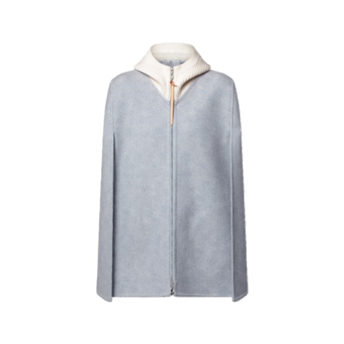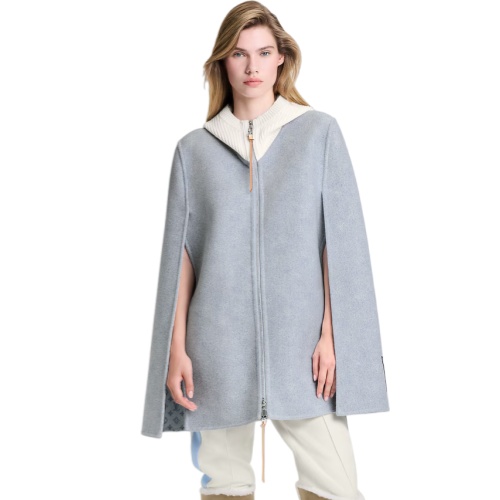 This cape exudes après-ski elegance in a cozy double-face wool-silk blend in a subtle denim effect. It is cut in an understated mid-length shape with slits at the sides for comfortable wear. A contrasting ribbed hood and double-zipper fastening underscore the sporty spirit, while a seasonal Louis Vuitton mountain patch and a Monogram jacquard sign the look.