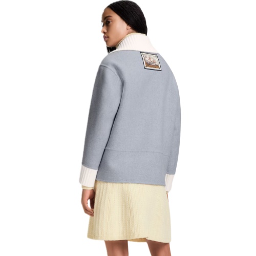 This jacket is cozy and contemporary in a double-face wool-silk blend in a trompe l’oeil denim effect. The oversized silhouette is emphasized with the exaggerated shawl collar and cuffs in contrasting ribbing, and the front is fastened with two buttons. The inside is finished with a Monogram motif, while a Louis Vuitton mountain patch signs the back.