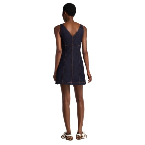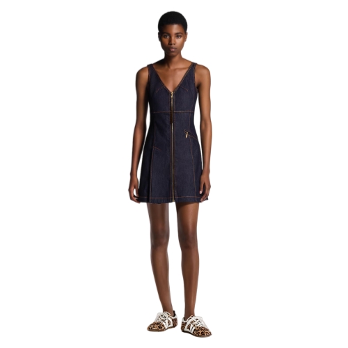 This mini dress has chic, everyday appeal in dark-wash denim cut with a fitted V-neckline top and an A-line skirt for a feminine silhouette. The front is detailed with a full-length exposed zipper trimmed with a Monogram canvas pull, which is complemented by a fastened slanted pocket on the hip.