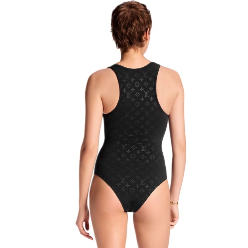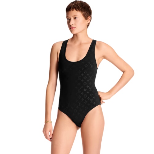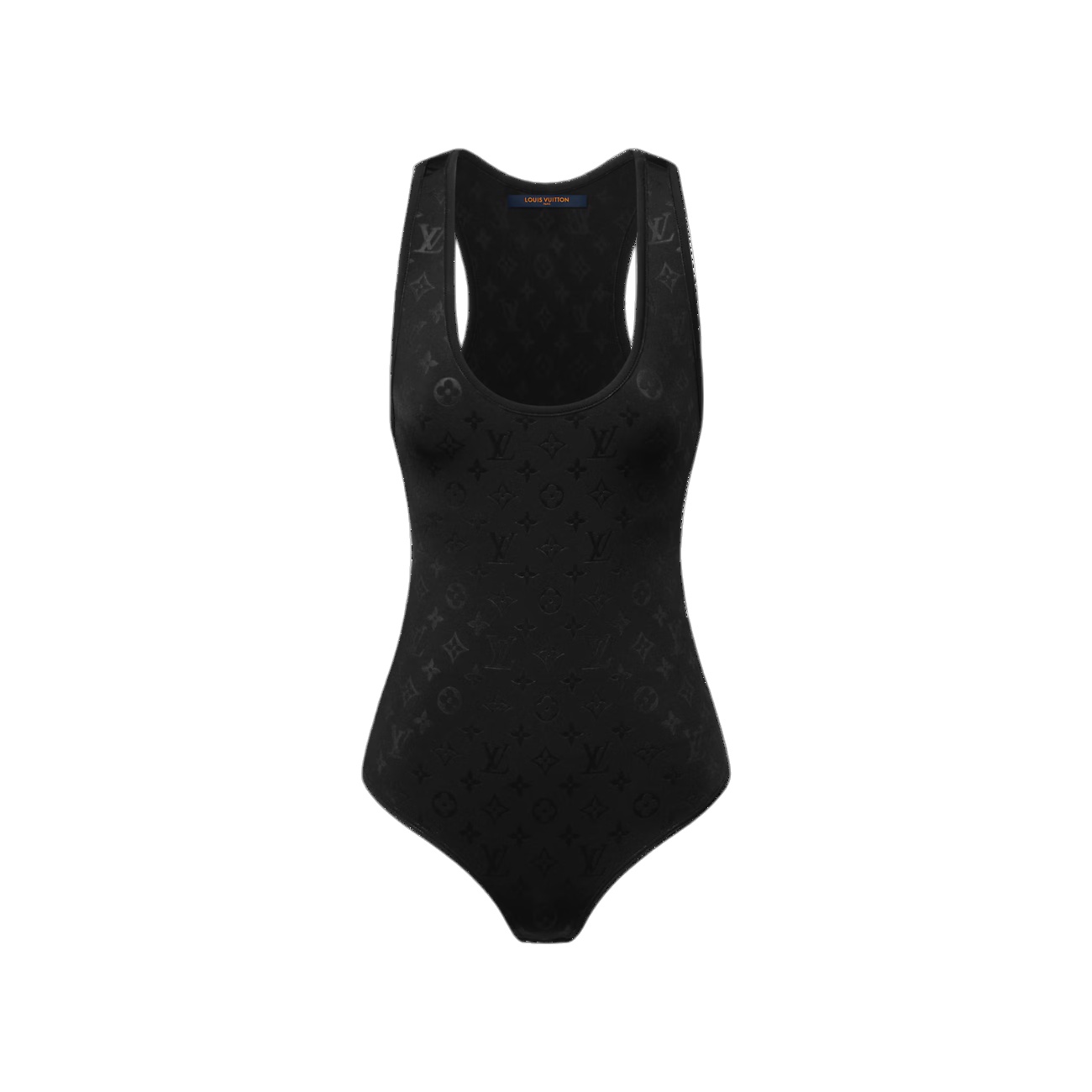 This body has a modern, sporty look in smooth, flexible technical jersey with the House’s iconic Monogram motif featuring as a subtle allover signature in relief. It is cut in a clean silhouette with a flattering scoop neckline and a sporty racerback, complete with a hook-and-loop fastening.