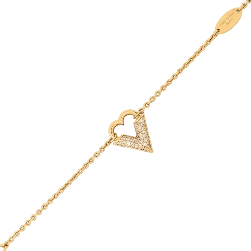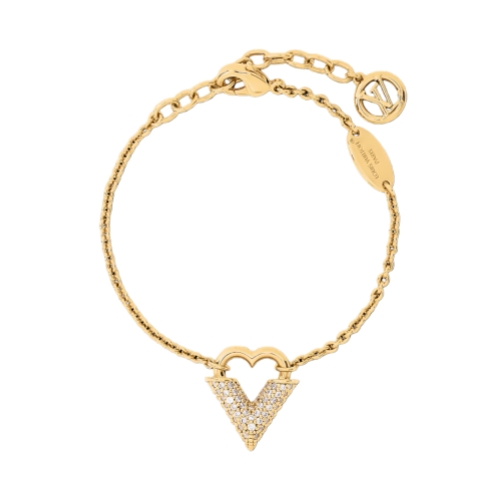 The enchanting design of the Essential Love bracelet is an elegant tribute to the magic of romance. Its delicate gold-toned chain culminates in a heart-shaped charm integrating the House’s iconic V emblem, heightened with resplendent rhinestones. A subtle way to wear the Louis Vuitton signature, and a precious expression of love and affection.