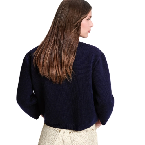 This cardigan has a refined, modern feel in a cozy wool blend finished with chunky ribbed hems and discreet topstitching. Large metallic buttons add a polished detail to the front fastening and flap pocket on the chest, while a Monogram canvas tab discreetly signs the left sleeve.