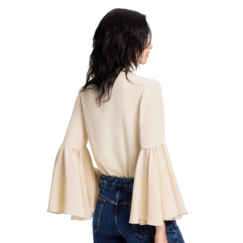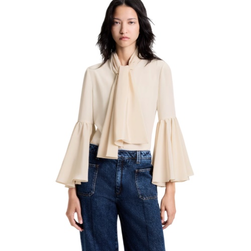 This blouse exudes romance with fluid lines. It is crafted from soft, airy silk crepe de chine in a sophisticated shade for elevated styling. Flared sleeves add graceful volume to the straight-cut silhouette, while the neckline is finished with breezy lavalliere ties. A discreet Monogram canvas top button completes the look with an understated signature.