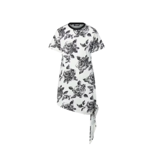 Bold seasonal codes uplift this T-shirt dress with a chic, sporty spirit. It is cut from soft cotton jersey featuring an allover print of the collection’s graphic Pop Art-style floral motif. The casual straight shape is detailed with a contrasting crew neckline and an asymmetrical knotted hemline for a breezy finishing touch.