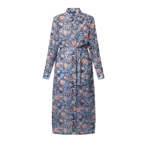 This shirt dress has a fresh, romantic spirit in lightweight cotton voile featuring an allover print of this season’s signature floral vine motif. It is cut in a clean, full-length shape with long sleeves, a hidden button tab and a smart collar, while a coordinating D-ring belt accentuates the waistline for a flattering silhouette.