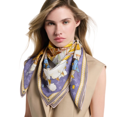 Crafted in sumptuous silk, the From The Cloud Square is a wearable work of art. Its richly detailed pattern depicts a fleet of colorful hot air balloons soaring through the sky above Paris, with classic Louis Vuitton trunks in tow. This exceptional, elegant accessory captures the very essence of the House’s heritage and travel spirit.