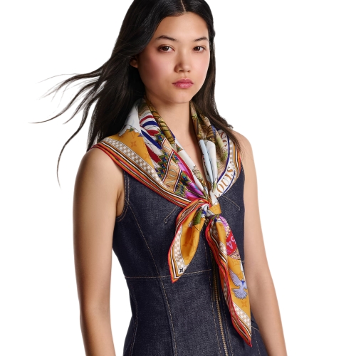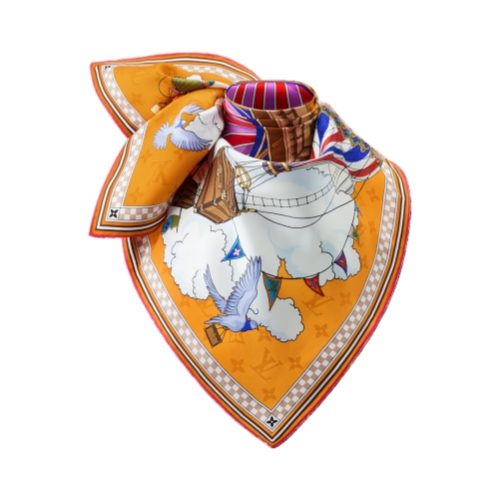 Crafted in sumptuous silk, the From The Cloud Square is a wearable work of art. Its richly detailed pattern depicts a fleet of colorful hot air balloons soaring through the sky above Paris, with classic Louis Vuitton trunks in tow. This exceptional, elegant accessory captures the very essence of the House’s heritage and travel spirit.