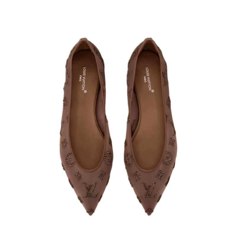 The Gala flat ballerina is an easy-to-wear yet glamorous style in mesh embroidered with rhinestones forming the Louis Vuitton Monogram pattern. The semi-translucent mesh subtly reveals the foot, while the sparkling rhinestones create a jewel-like effect. This sleek and feminine ballet pump is finished with a fine leather outsole.