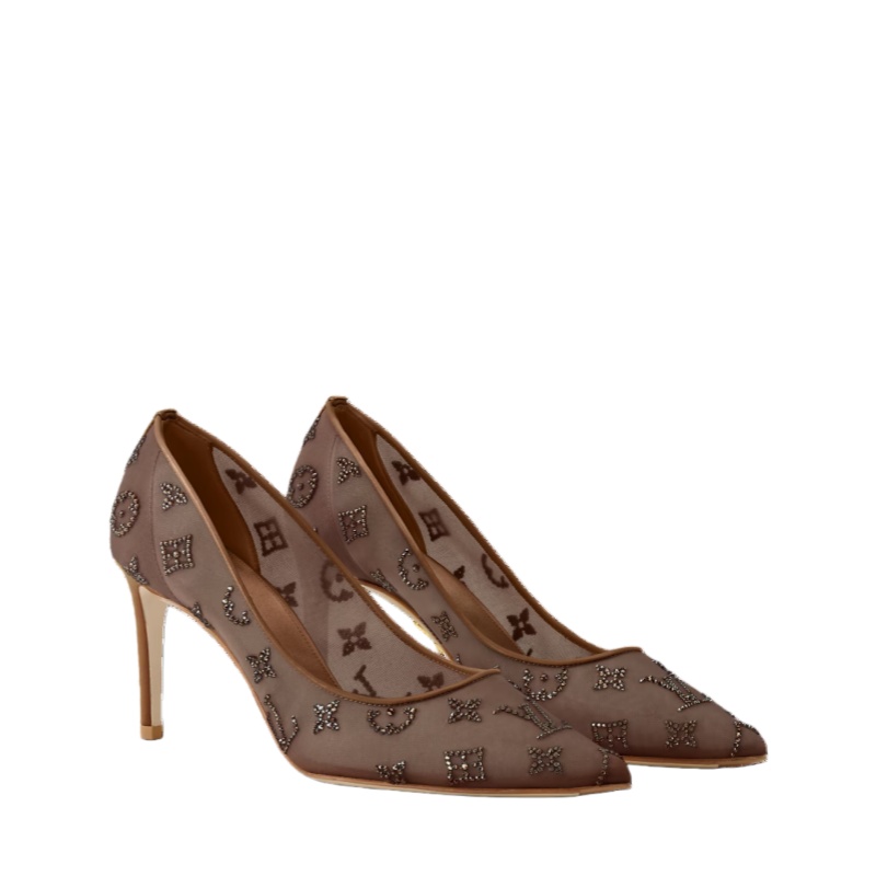 The Gala pump is an elegant, evening-ready style in mesh embroidered with sparkling rhinestones, which form the iconic Monogram pattern. The sleek lines of the upper are complemented by a slender stiletto heel, while the fine leather outsole is embellished with an LV Initials accessory in gold-toned metal.