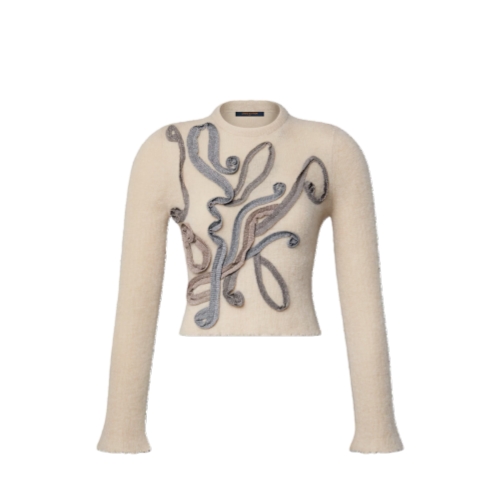 This pullover makes a sophisticated statement thanks to the runway’s rich embellishments. It is spun from a soft, lightweight mohair-blend knit in an elegant form-fitting shape with a crew neckline. Delicate lettuce hems soften the silhouette, while the front is festooned with an abstract arrangement of glittery ribbons in romantic shades for a playful, textured touch.