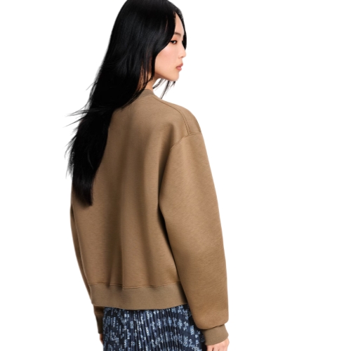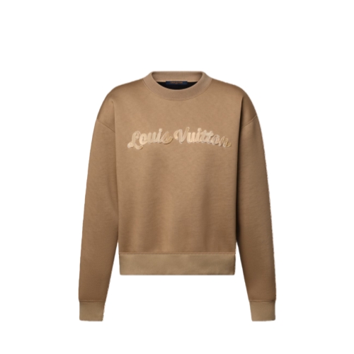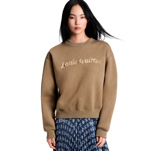 This sweater has effortless everyday appeal in cozy double-face jersey in a warm seasonal shade trimmed with ribbed hems around the crew neckline, cuffs and waist. The chest is embellished with a cursive Louis Vuitton signature in a tonal gradient finish for a fresh House touch.