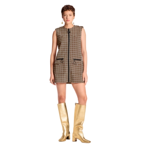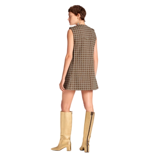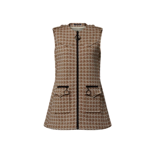 This tapered mini dress has a graphic yet elegant look in wool spun in the collection’s honeycomb jacquard in a soft colorway. Epaulettes, buttoned flap pockets and angular seam details across the chest and back introduce a smart, structured feel, while matte black zippers trimmed with LV Gravity pulls add a modern contrast.