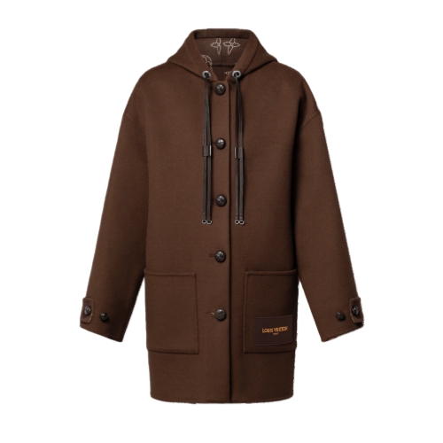 This cozy coat is crafted from a double-face wool-silk blend in a rich seasonal shade with a tonal Monogram motif inside. The boxy shape is emphasized with patch pockets, one of which is signed with a Louis Vuitton scarf tag. The hood is trimmed with leather drawstrings and the front is fastened with coordinating leather buttons.