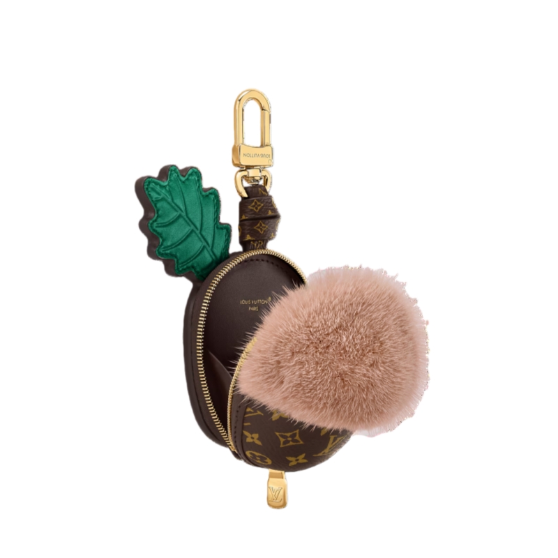 The eye-catching LV Acorn pouch offers a delightful combination of functionality and adorable style. A plump acorn crafted in Monogram leather is adorned with a colorful leaf and a cap in soft mink fur for a plush tactile effect. This unique bag charm is also a practical zip-up pouch, perfect for carrying earbuds and other small essentials.