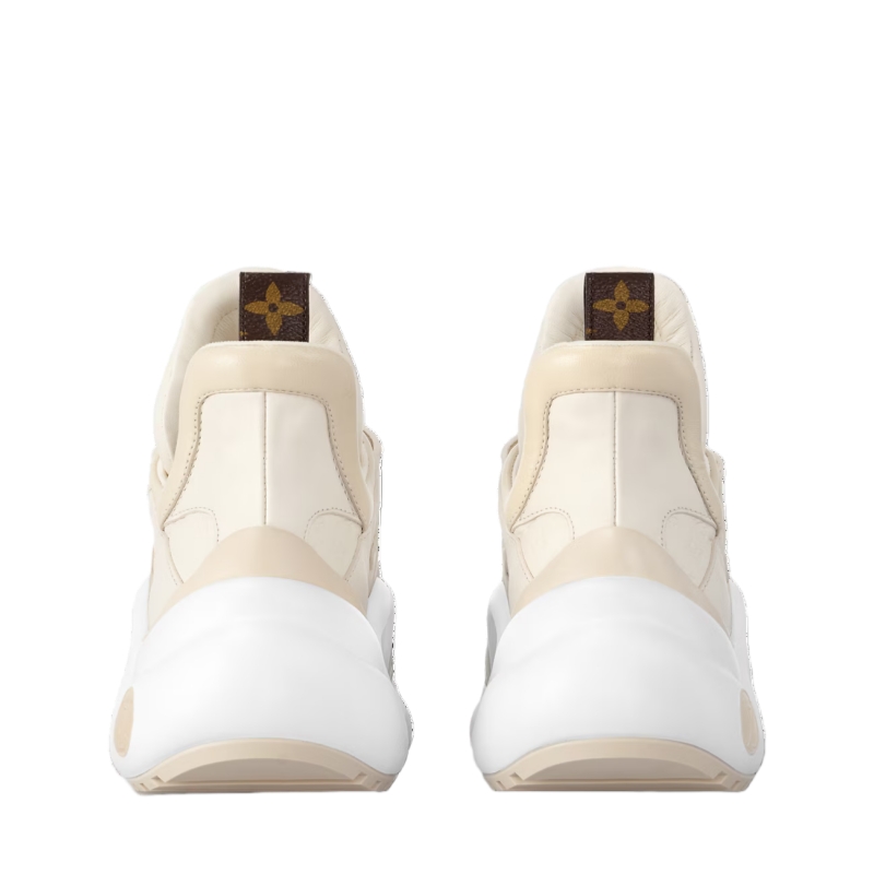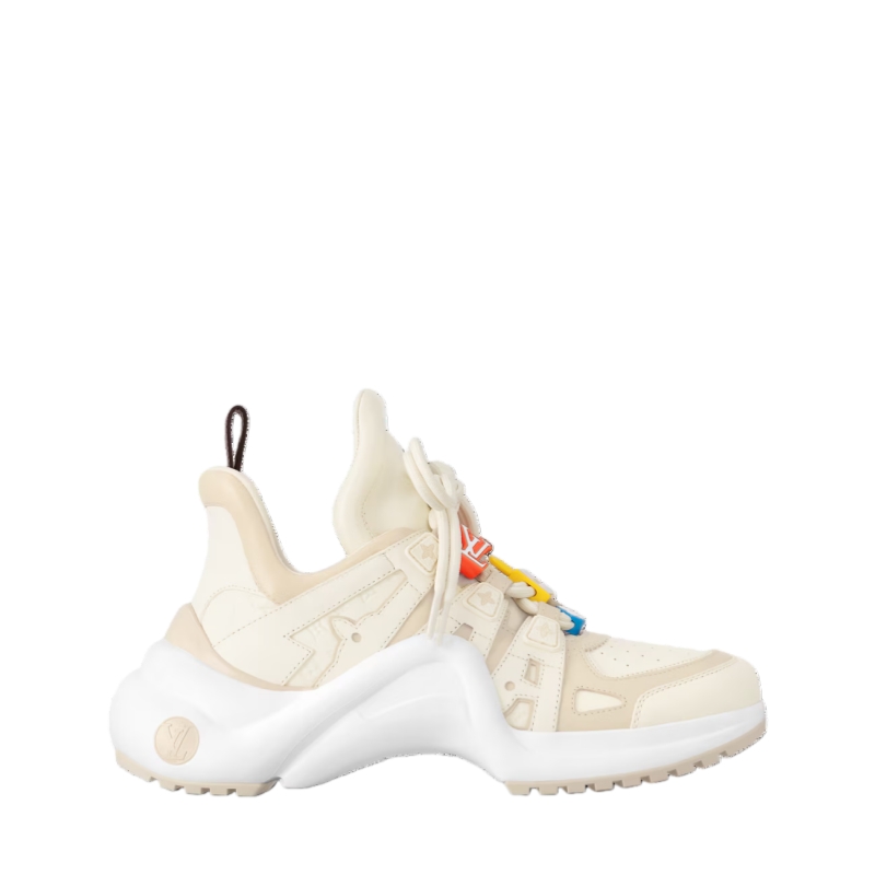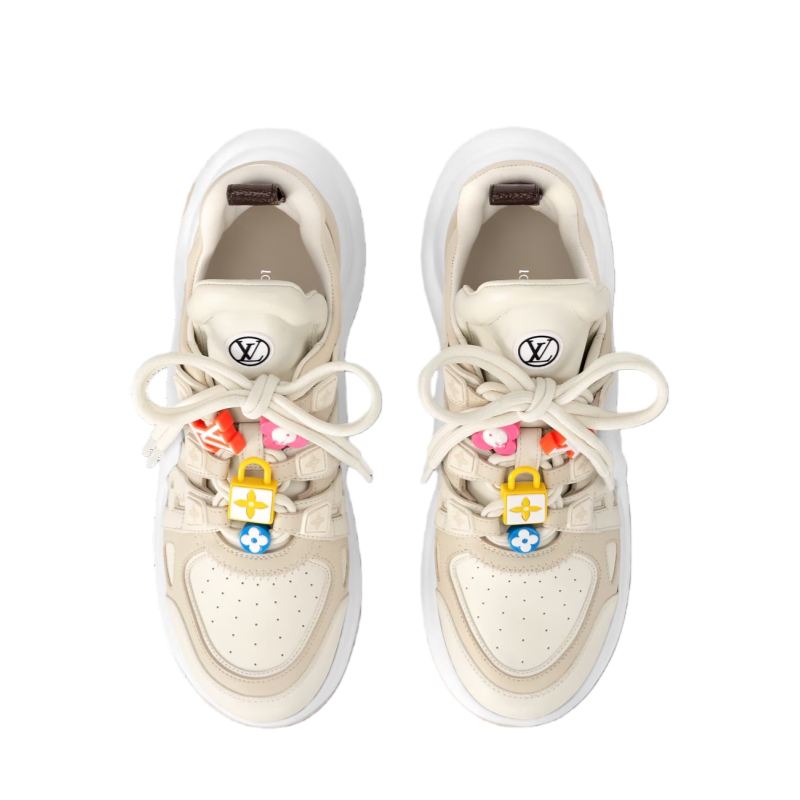 The LV Archlight sneaker is reinterpreted this season in soft calf leather with playful details, notably colorful LV Initials and Monogram Flower beads on its double laces. The upper also features discreet Monogram Flower references. This model is finished with a back loop in Monogram canvas and LV Circle signatures on its tongue and outsole.