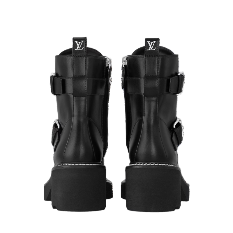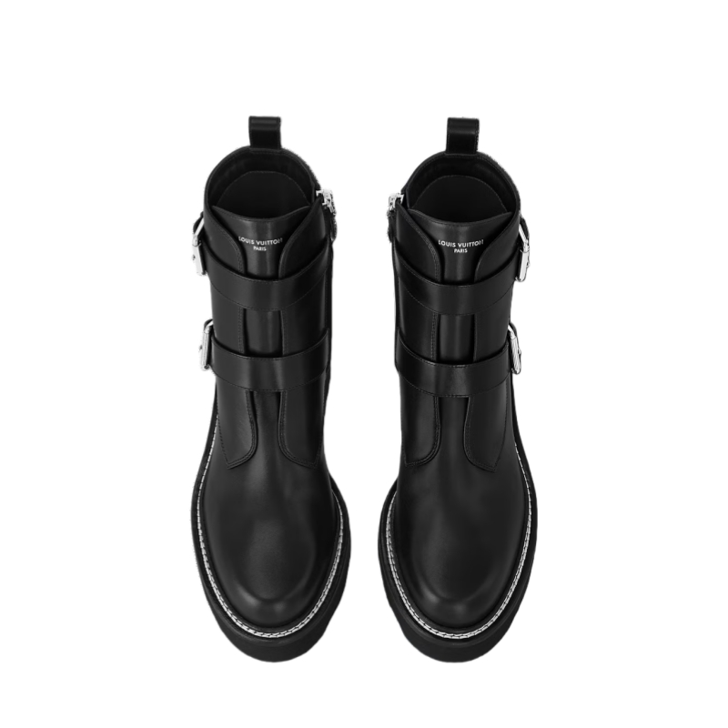 The LV Beaubourg ankle boot in smooth calf leather is notable for its two straps with engraved, silver-tone buckles, which give it an assertive, biker-inspired look. This model is notable for its chunky heel and lightweight micro outsole, which are highlighted by contrast stitching. The Louis Vuitton signature is embossed on the tongue.