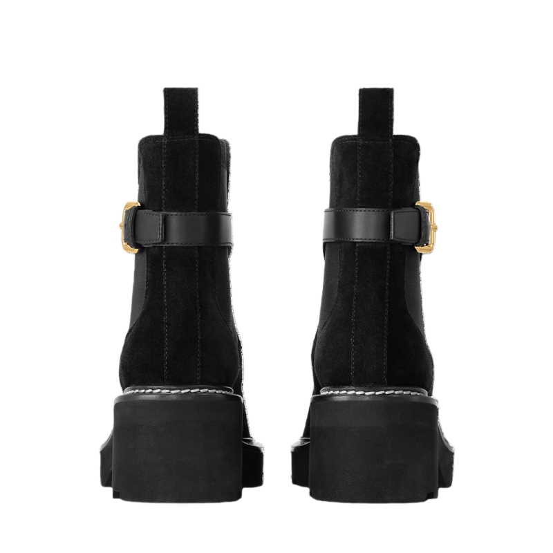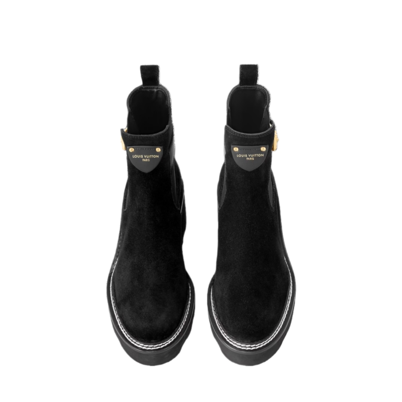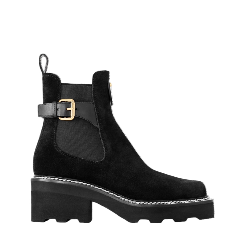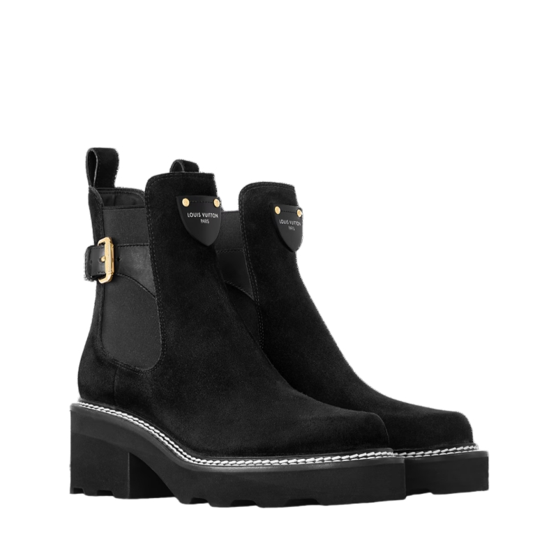 Crafted from velvety suede calf leather, the LV Beaubourg ankle boot nods to a Chelsea boot with its elastic side panels, while the leather belt detail references the ready-to-wear collection. Signed with a Louis Vuitton-embossed leather label, this easy-to-wear style comes on a sturdy heel and chunky yet lightweight micro outsole.