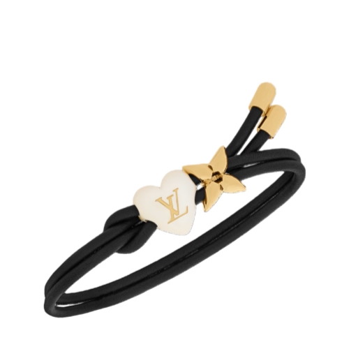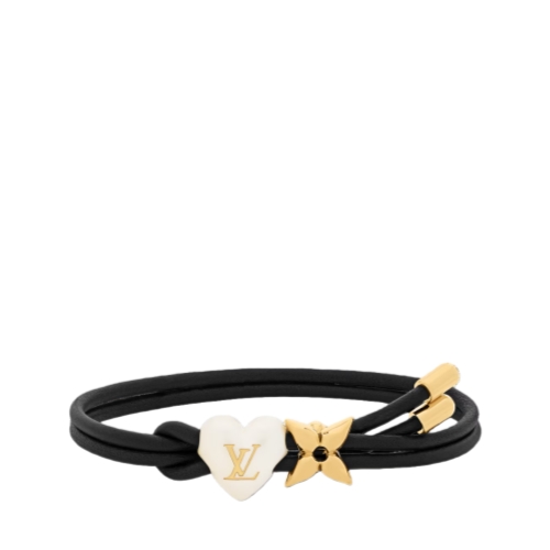 Inspired by the House’s iconic emblems, the LV Bloom Pearl Heart bracelet is an exquisite expression of affection. On a double leather cord, a Monogram Flower in gleaming gold-toned metal is paired with a heart-shaped resin pearl delicately engraved with the LV Initials. A refined, easy-to-wear bracelet with an enchanting romantic aura.