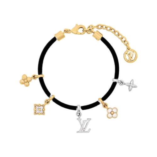 With its refined details and sophisticated design, the LV Blooming Strass bracelet makes a strong signature statement. Its slim calfskin cord holds an array of House icons, including Monogram Flowers and the LV Initials, finely crafted in gold and silver-colored metal and enlivened with sparkling zircons. Ideal for adding a striking touch of feminine elegance to any look.